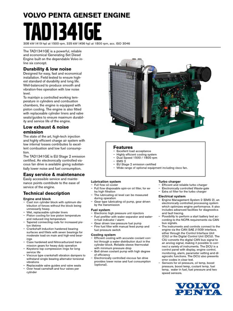 موتور Volvo TAD 1341 GE یک موتور دیزل صنعتی قدرتمند است. شرکت ولوو پنتا این موتور را برای ژنراتورهای برق صنعتی طراحی کرده است. این مدل توان خروجی حدود300 تا 350 کاوا ارائه میدهد. صنایع بزرگ از این موتور برای تأمین برق پایدار استفاده میکنند.