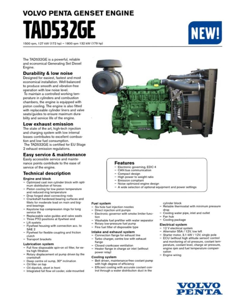 شرکت ولوو موتور TAD 532 GE را برای ژنراتورهای برق صنعتی طراحی کرده است. این موتور عملکرد پایدار و راندمان مناسبی ارائه میدهد و انتخابی مطمئن برای تأمین برق در پروژههای صنعتی به شمار میرود